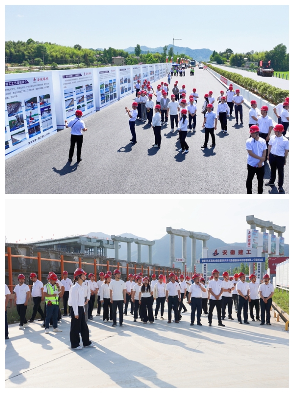 在安徽路橋宣涇高速一期03標(biāo)項目,青年們參觀了項目駐地及黨群活動場所,在施工現(xiàn)場觀摩了解了瀝青無人攤壓技術(shù)和新澤西護欄預(yù)制安裝等施工工藝。在安徽水利涇青高速二分部,青年們先后參觀了青弋江特大橋安全文明施工以及場站和安全體驗館標(biāo)準化建設(shè)情況。