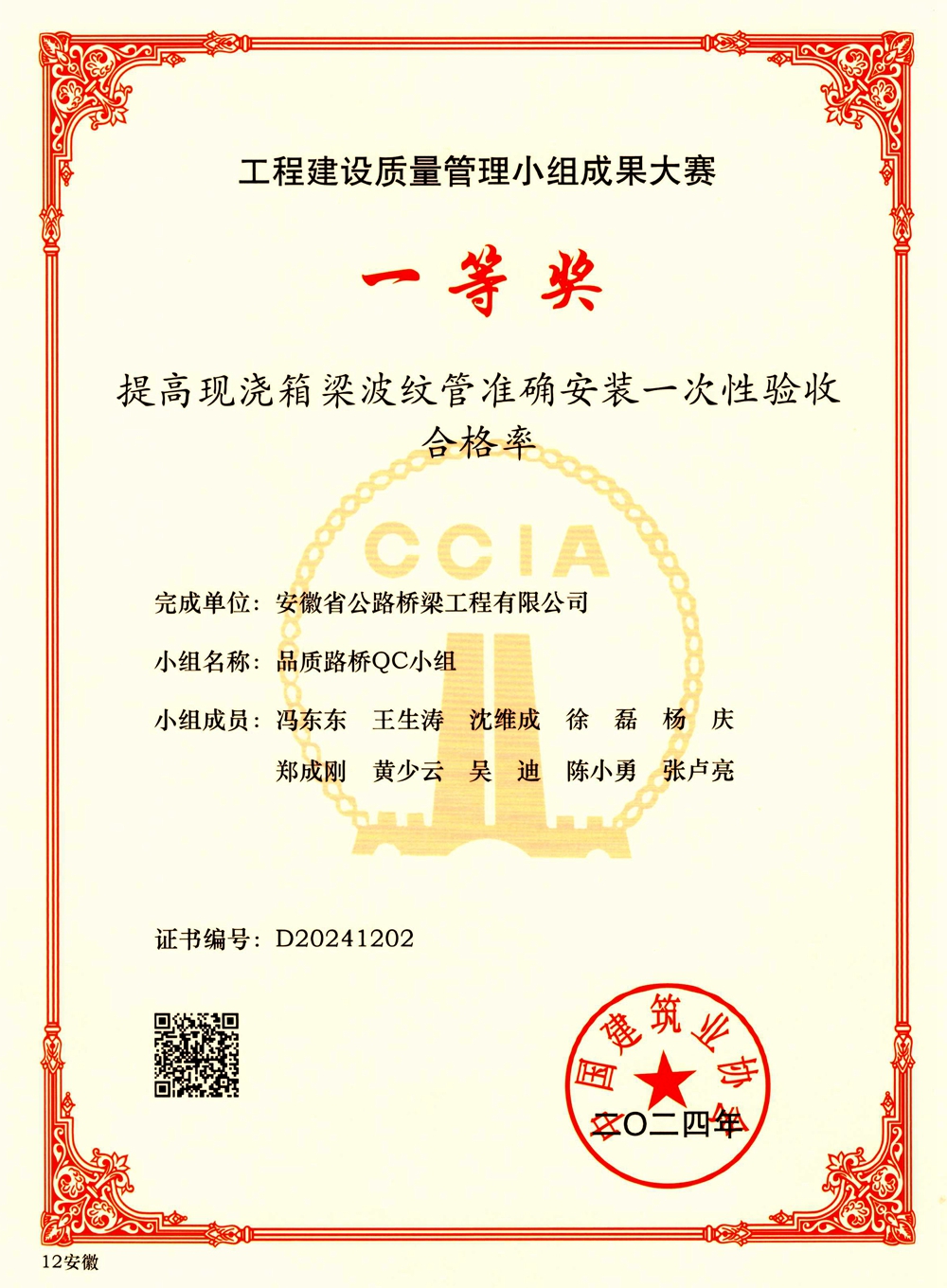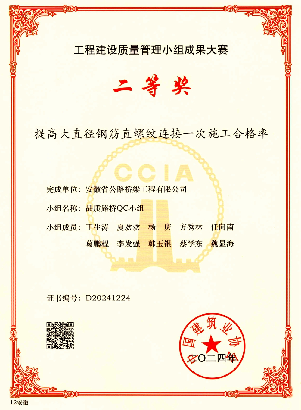 本次QC決賽共發(fā)布751項成果。公司推薦的《提高索導管定位安裝一次性驗收合格率》《提高現澆箱梁波紋管準確安裝一次性驗收合格率》2項QC成果獲一等獎,《提高大直徑鋼筋直螺紋連接一次施工合格率》QC成果獲得二等獎。
