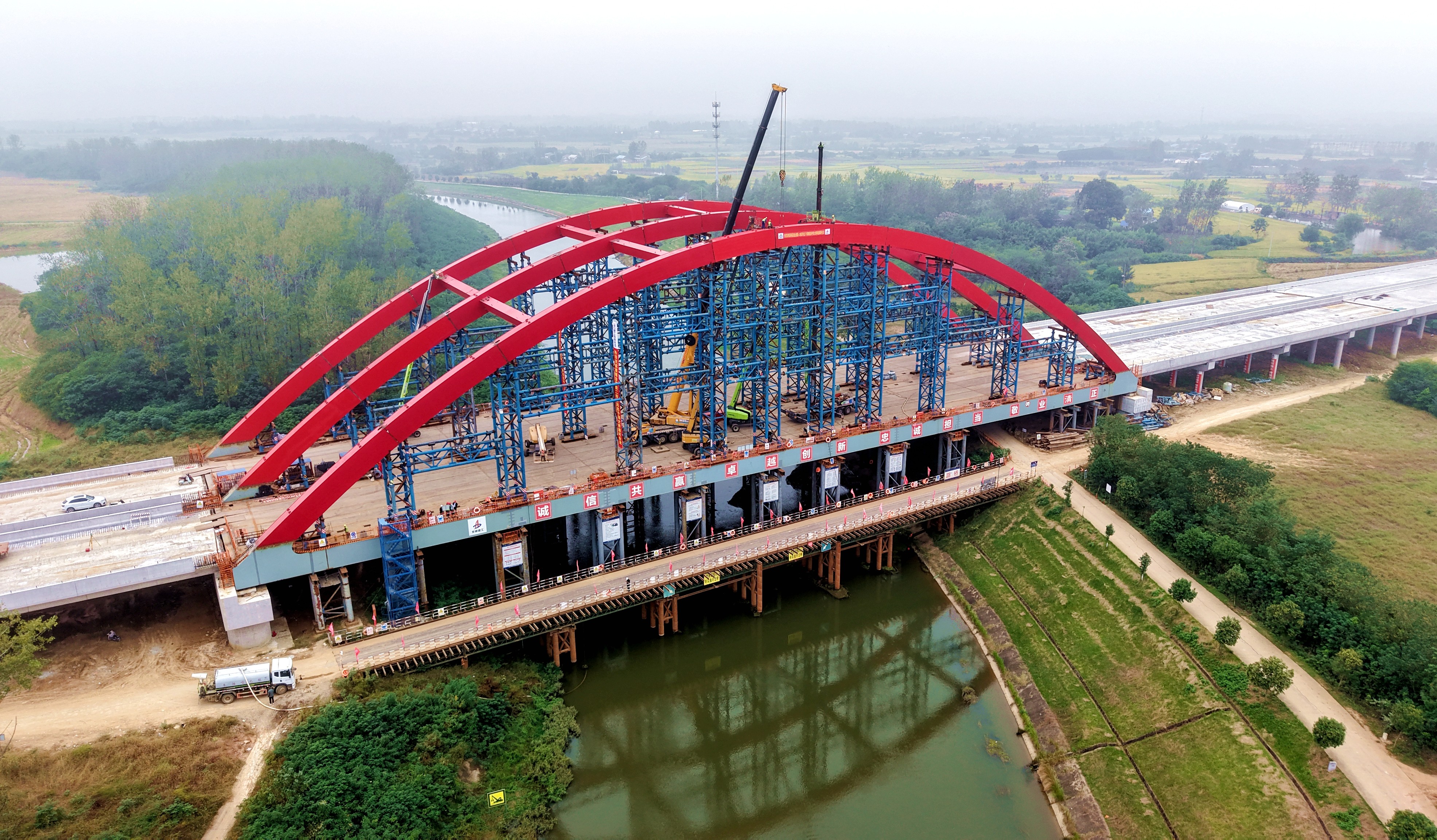 淠河總干渠大橋是項目關鍵控制性工程之一,主跨長140米,橋面寬39.6米,采用先梁后拱法施工。此次合龍的拱肋段長9米,單段重量達21.3噸,隨著吊裝作業(yè)精準到位,標志著該大橋主體結構取得突破性進展,為后續(xù)工程收官奠定基礎。施工中項目部緊緊圍繞質量、安全、環(huán)保等目標,結合溫度監(jiān)測合龍口參數(shù),選擇適宜時段實現(xiàn)高精度合龍。