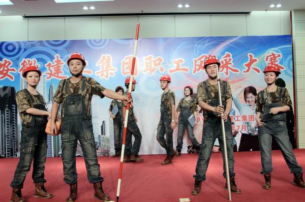 公司12名職工分別展示了三套服裝。第一套職業(yè)裝突破了傳統(tǒng)職業(yè)裝的局限,以背帶牛仔工裝褲為主,別具一格。再搭配安全帽、對講機(jī)等施工現(xiàn)場道具,將路橋的職業(yè)特性展示的淋漓盡致,在眾多參賽隊(duì)伍中獨(dú)樹一幟。第二套時(shí)裝,由六位女職工身著綴滿亮片的五彩短裙,在輕快動(dòng)感的音樂下,充分展現(xiàn)了女職工的青春活力。第三套藝術(shù)裝,以晚禮服為主,四位男職工風(fēng)度翩翩,四位女職工婀娜多姿,凸顯了路橋兒女的別樣情懷。