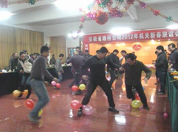 四支代表隊(duì)分別在綁腳聯(lián)體賽跑、集體造句、搶椅子、瞎子擊鼓、辯真假、踩氣球等游戲環(huán)節(jié)展開了激烈競爭,現(xiàn)場掌聲連連,笑聲、歡呼聲此起彼伏,氣氛十分熱烈。最終飛龍代表隊(duì)在最后一個(gè)游戲環(huán)節(jié)力壓奔馳隊(duì)獲得一等獎。在游戲中間的節(jié)目表演環(huán)節(jié),各隊(duì)多才多藝的隊(duì)員們爭相登臺表演,有人唱歌、有人舞蹈、還有人一秀太極拳,競賽的節(jié)目使聯(lián)歡會高潮迭起、亮點(diǎn)紛呈。聯(lián)歡會上還安排了讓人激動的抽獎活動。