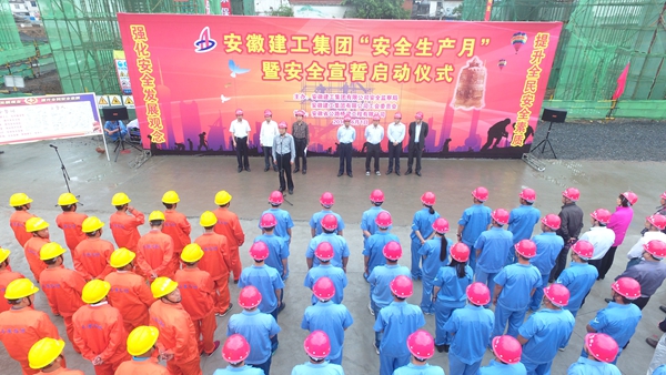 在集團公司工會主席徐曉光的帶領下,所屬各單位領導、安全管理人員,郎溪路項目全體管理人員及一線工人約200人舉起右手,鄭重宣誓:“我是一名安徽建工人,我鄭重宣誓,時刻注意安全,遵守安全法規(guī)。履行安全職責,提高安全技能。杜絕三違現(xiàn)象,保證四不傷害。強化紅線意識,促進安全發(fā)展。為了家人幸福、企業(yè)發(fā)展,誓做建工‘安全人’”。莊嚴的誓詞久久回蕩在項目現(xiàn)場,更加堅定了全體建工人“強化紅線意識,促進安全發(fā)展”的信心和決心。