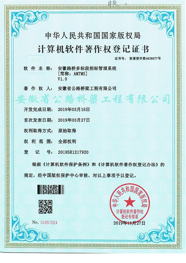 近日,《安徽路橋多標(biāo)段招標(biāo)管理系統(tǒng)V1.0》《安徽路橋關(guān)鍵績效考核管理系統(tǒng)V1.0》等五項管理系統(tǒng)取得國家版權(quán)局頒發(fā)的計算機(jī)軟件著作權(quán)。