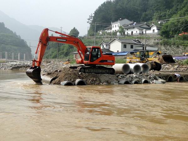 從27日開始,天氣放晴,水位下降,我部抓住機(jī)會(huì)進(jìn)行第三次搶修,一臺(tái)挖機(jī)、一臺(tái)裝載機(jī)和五臺(tái)運(yùn)輸車同時(shí)作業(yè),終于在28日上午打通便橋。項(xiàng)目部迅速組織人員把施工設(shè)備、施工材料調(diào)運(yùn)到對(duì)面,28日下午恢復(fù)小型結(jié)構(gòu)物施工。