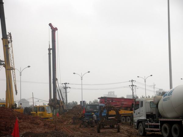 目前,項(xiàng)目部已具備辦公條件,主要管理人員已基本到位,道排、橋梁、樁基、擋墻等施工隊(duì)伍已進(jìn)場施工,并于7月5日,完成首根樁基的澆筑。項(xiàng)目部在人員不足,桿管線、污水燃?xì)夤艿厘e綜復(fù)雜等不利因素的影響下,利用現(xiàn)有條件充分挖掘工作面。截止7月17日,已完成駐地建設(shè),懷寧路下穿橋支護(hù)咬合樁33根、下穿橋樁基28根,翡翠路上跨橋鉆孔樁22根,棄土方14600方、溝槽開挖2840方,回填2180方,雨污水管道埋設(shè)約730米,累計(jì)完成產(chǎn)值約1000萬元。