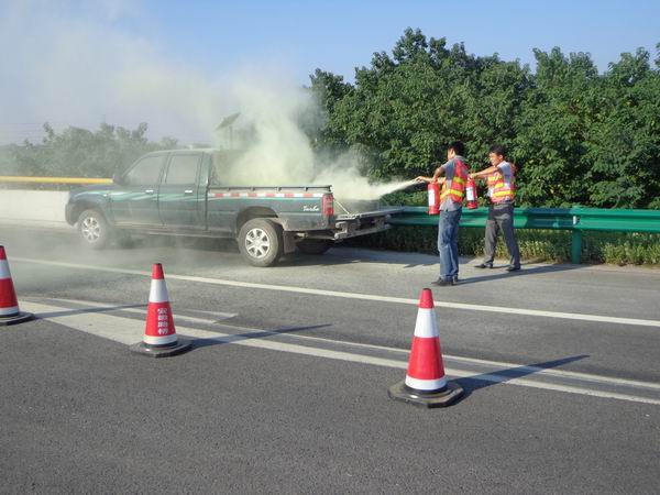 16:40,隨著蕪宣高速公路管理公司副總經(jīng)理郭建華的一聲令下,蕪宣養(yǎng)護(hù)項(xiàng)目組織開展的突發(fā)交通事故處置聯(lián)合演練開始。16時(shí)45分,事故車輛撞向錐標(biāo),沖入封閉區(qū)并撞壞護(hù)欄。16:46,巡標(biāo)員發(fā)現(xiàn)事故,立刻補(bǔ)齊被撞倒錐標(biāo),并向項(xiàng)目安全環(huán)保部負(fù)責(zé)人報(bào)告;同時(shí)安排其他巡標(biāo)員到事故車輛后方搖旗警示。16:48,項(xiàng)目安全環(huán)保部負(fù)責(zé)人李剛就事故情況報(bào)告監(jiān)控中心,并向項(xiàng)目應(yīng)急救援小組組長曹祝林匯報(bào)事故情況。16:54,蕪湖市高速交警一大隊(duì)巡警及施救組趕到事故現(xiàn)場,組織對駕駛員進(jìn)行營救。16:55,施救組成員對受傷駕駛員傷口進(jìn)行消毒、包扎。16:57,事故車輛起火。16:58,項(xiàng)目應(yīng)急救援小組成員對事故車輛進(jìn)行滅火。17:02,路政部門到達(dá)現(xiàn)場,對事故車輛進(jìn)行勘察,并向陪乘人員了解事故情況及駕駛員情況。17:11,對蕪宣方向車輛進(jìn)行管制。17:34,清障車在未知情情況下進(jìn)入事故現(xiàn)場,對事故車輛進(jìn)行施救。17:39,蕪宣方向交通開放,在交警、路政、項(xiàng)目巡標(biāo)員的指揮下緩慢行走。17:41,清掃組對事故現(xiàn)場的拋灑物、撞壞的錐標(biāo)等進(jìn)行清掃。17:45,交通恢復(fù)正常,郭建華總指揮宣布演練結(jié)束。